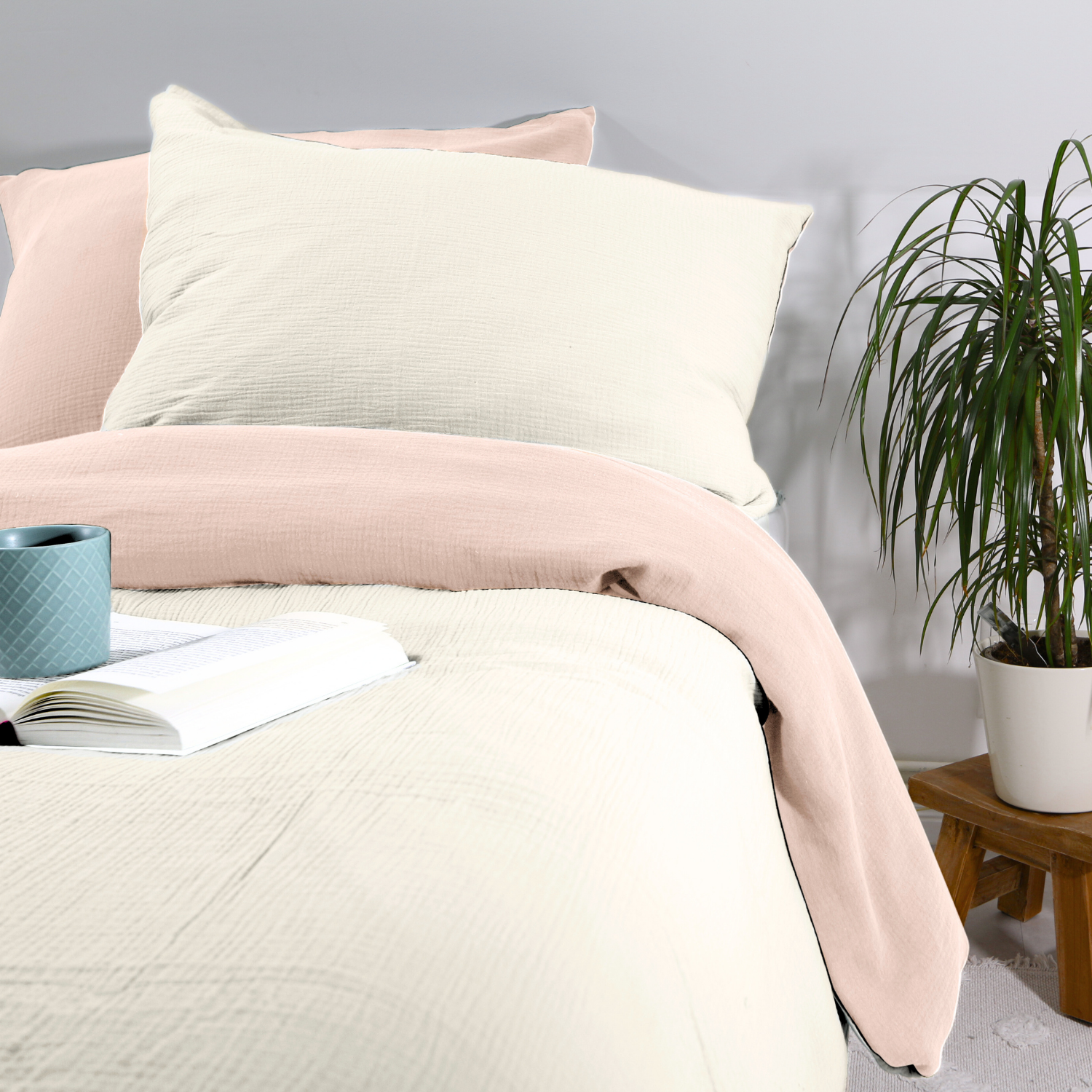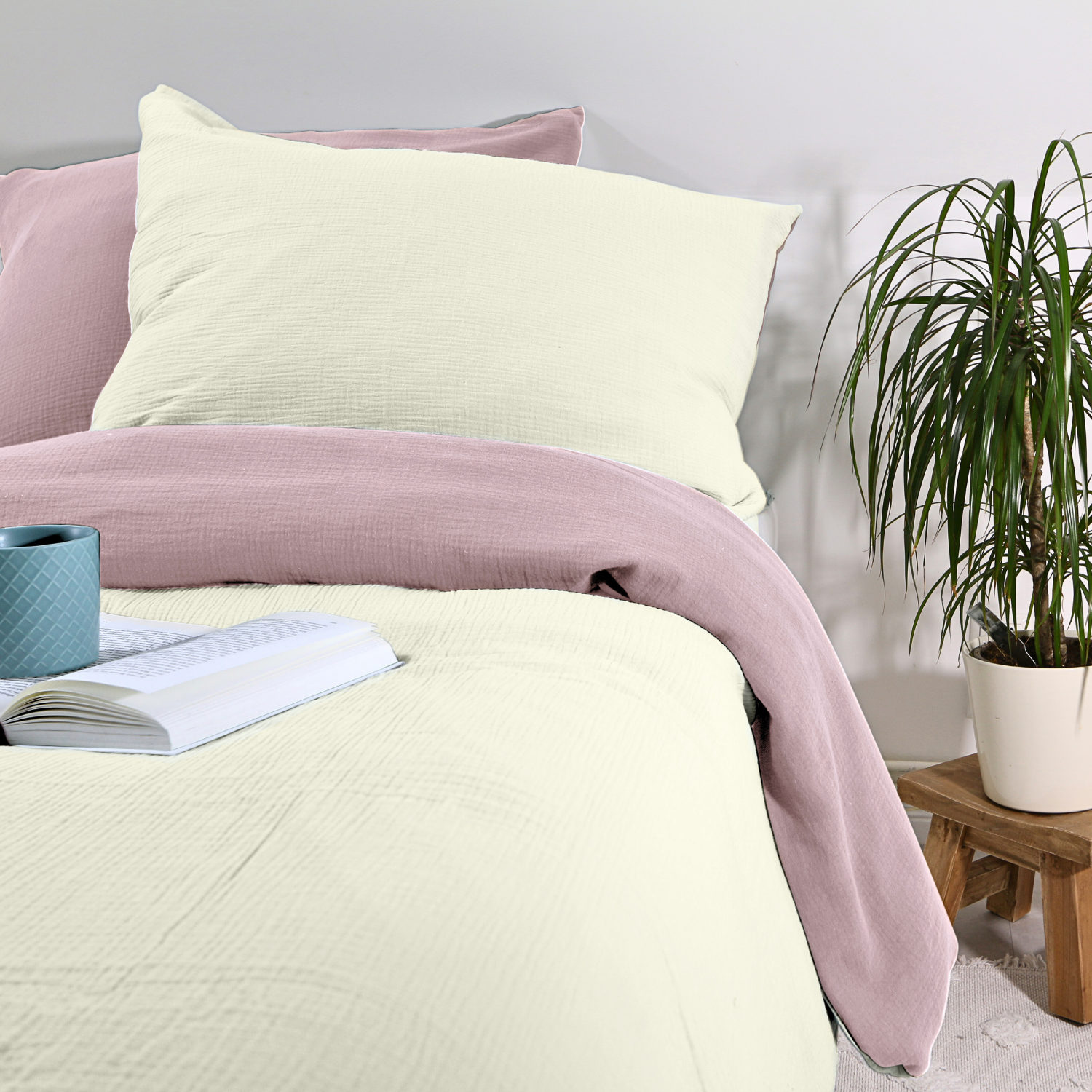 Entdecke unsere hochwertige Musselin Bettwäsche im zweifarbigen Design, hergestellt aus 100 % Bio-Baumwolle