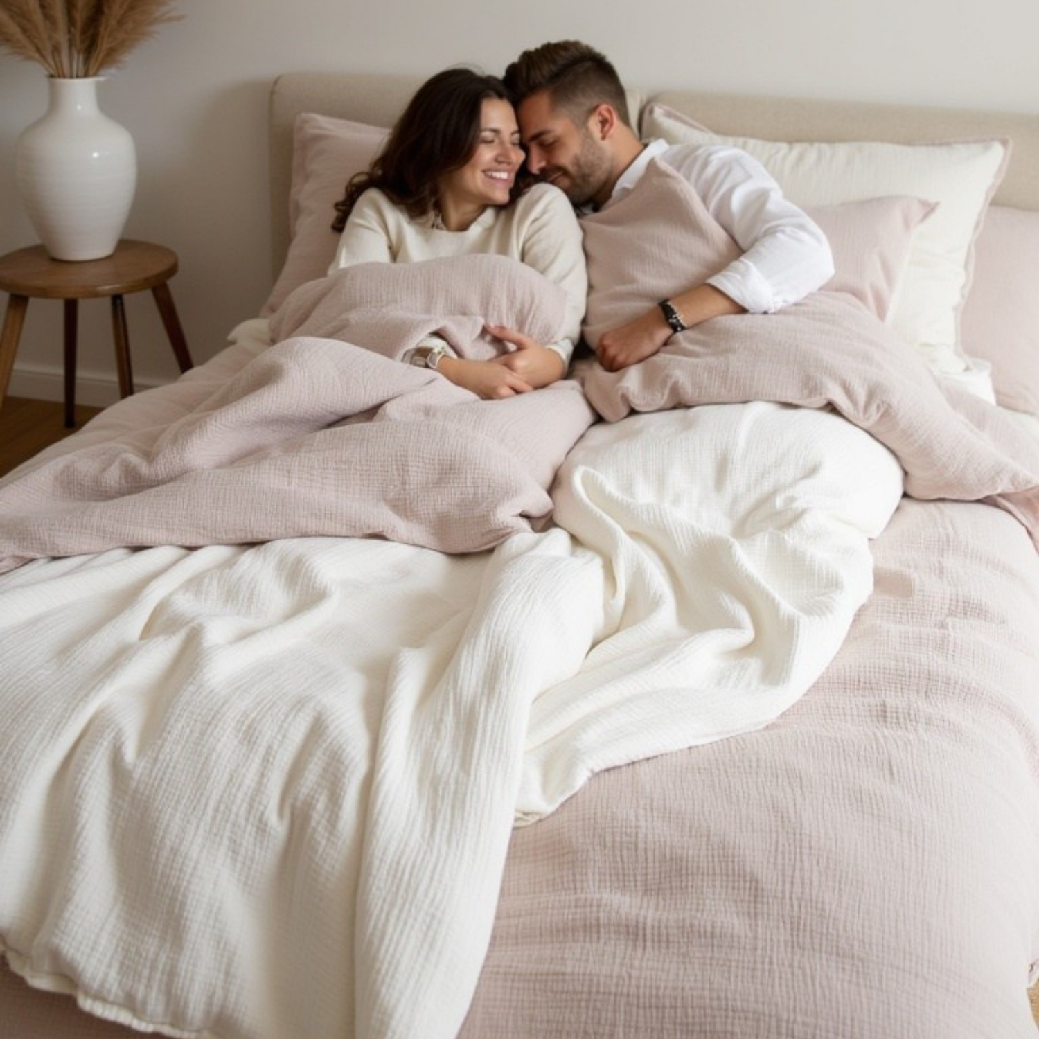 Entdecke unsere hochwertige Musselin Bettwäsche im zweifarbigen Design, hergestellt aus 100 % Bio-Baumwolle
