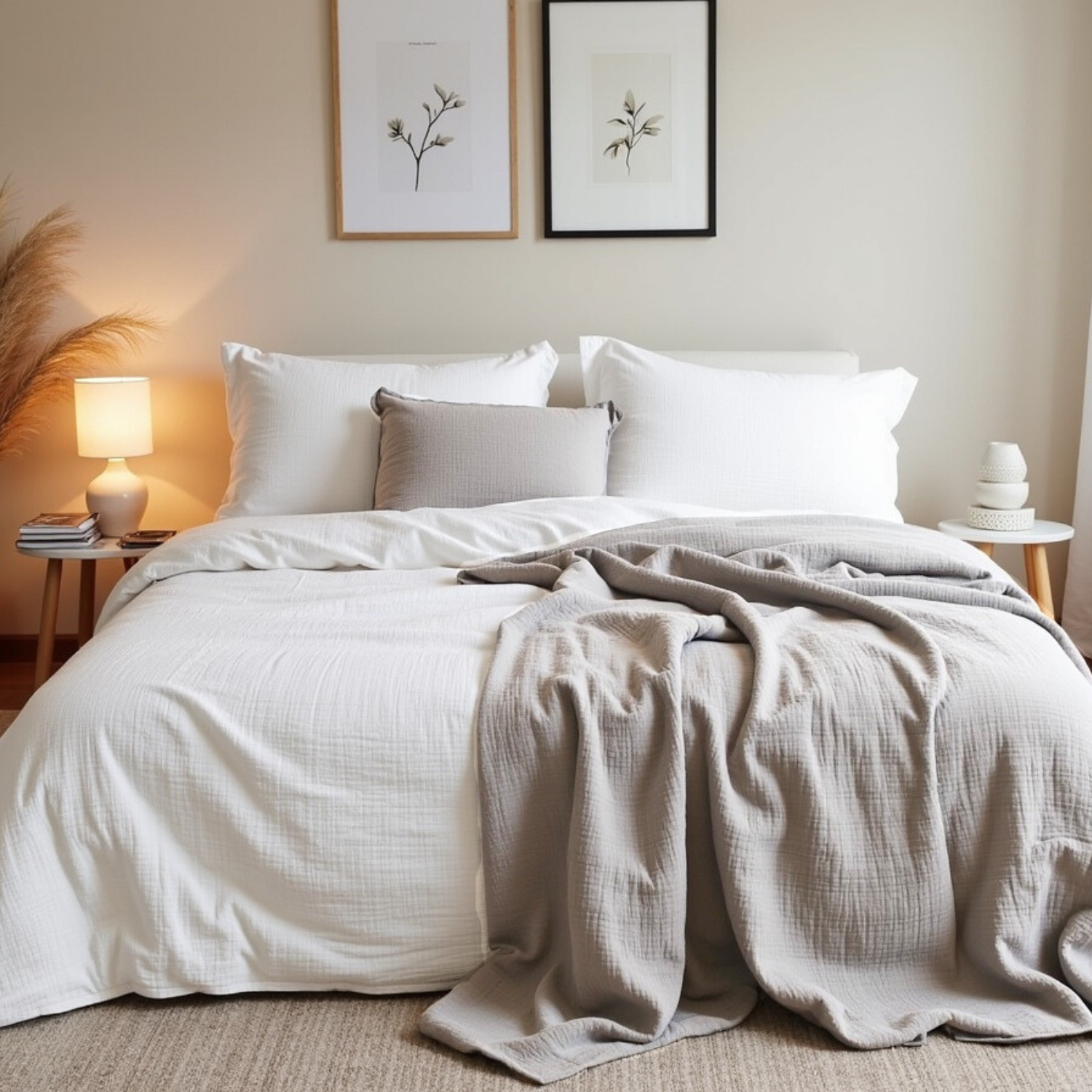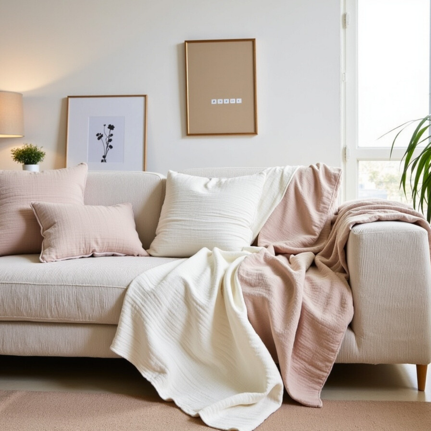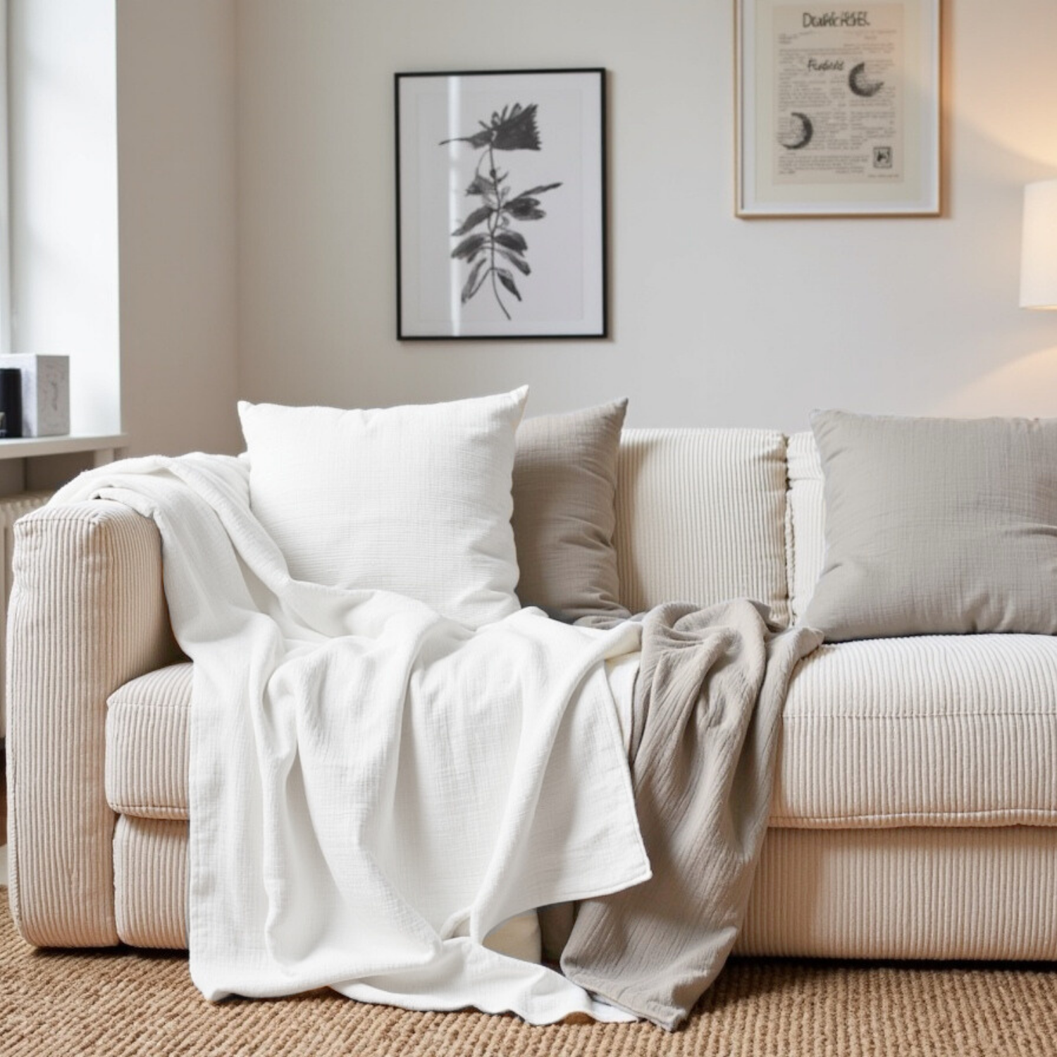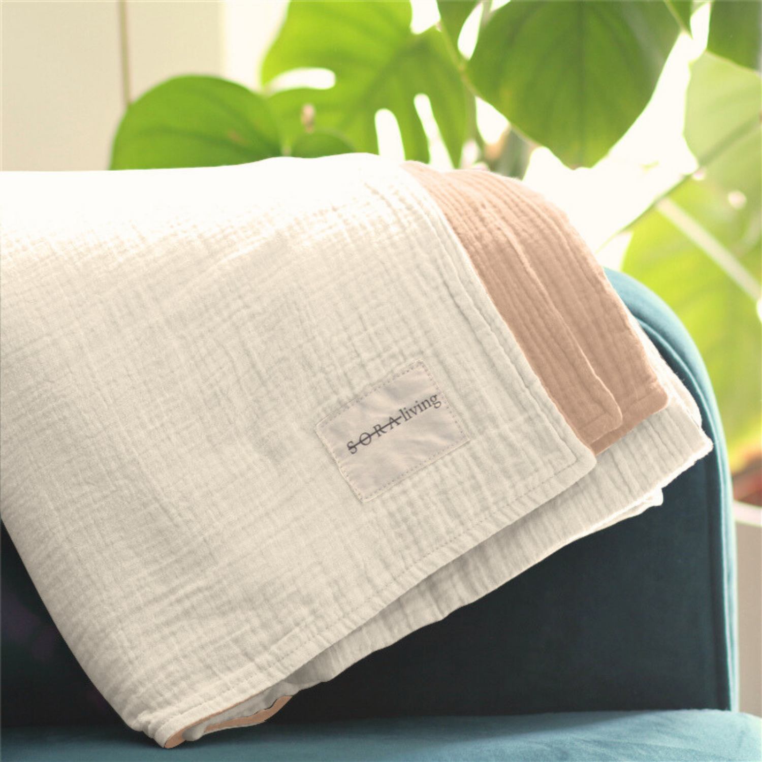 Entdecke unsere hochwertige Musselin Tagesdecke im zweifarbigen Design, hergestellt aus 100 % Bio-Baumwolle.